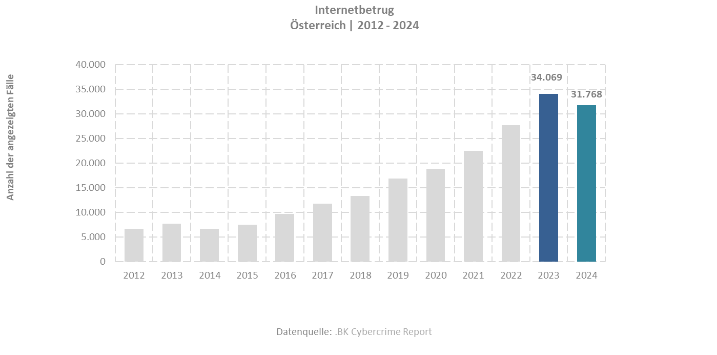 Die Zahl der Anzeigen wegen Internetbetrugs ist um 6,75 Prozent von 34.069 (2023) auf 31.768 (2024) Anzeigen gefallen. Dabei handelt es sich um den ersten Rückgang seit Jahren, wobei der Wert von 2023 auch den bisherigen Höchstwert markiert. Diese Zahlen der letzten Jahre veranschaulichen dennoch eine starke Zunahme der Delikte im Cybercrime-Bereich.
