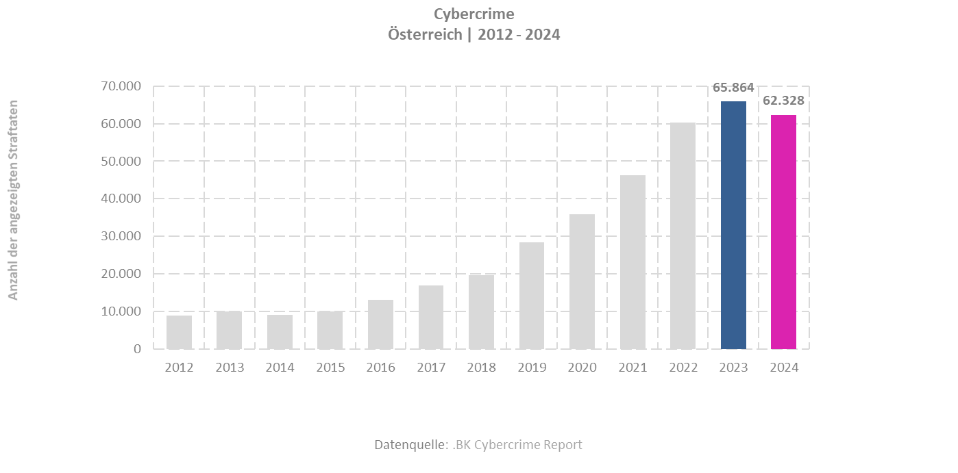 Nach Jahren des Anstiegs der österreichweiten Anzeigen wegen Cybercrime sank die Anzahl 2024 erstmals seit langem. Der Rückgang gegenüber dem Vorjahr lag bei etwas über 5 Prozent, auf nunmehr 62.328 Anzeigen (2023: 65.864 Anzeigen, bisheriger Höchstwert). Rund 31,7 Prozent der Straftaten wurde aufgeklärt.