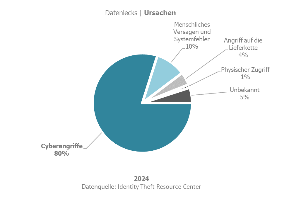 Der überwiegende Anteil an Datenlecks wurde im Jahr 2024 zu 80 Prozent durch Cyberangriffe ausgelöst. In 10 Prozent der Fälle waren entweder menschliches Versagen oder Systemfehler für ein Datenleck verantwortlich. In 4 Prozent der Fälle waren Angriffe auf die Lieferkette die Ursache und in 1 Prozent der Fälle bestand unberechtigter physischer Zugriff auf die Datensätze.
