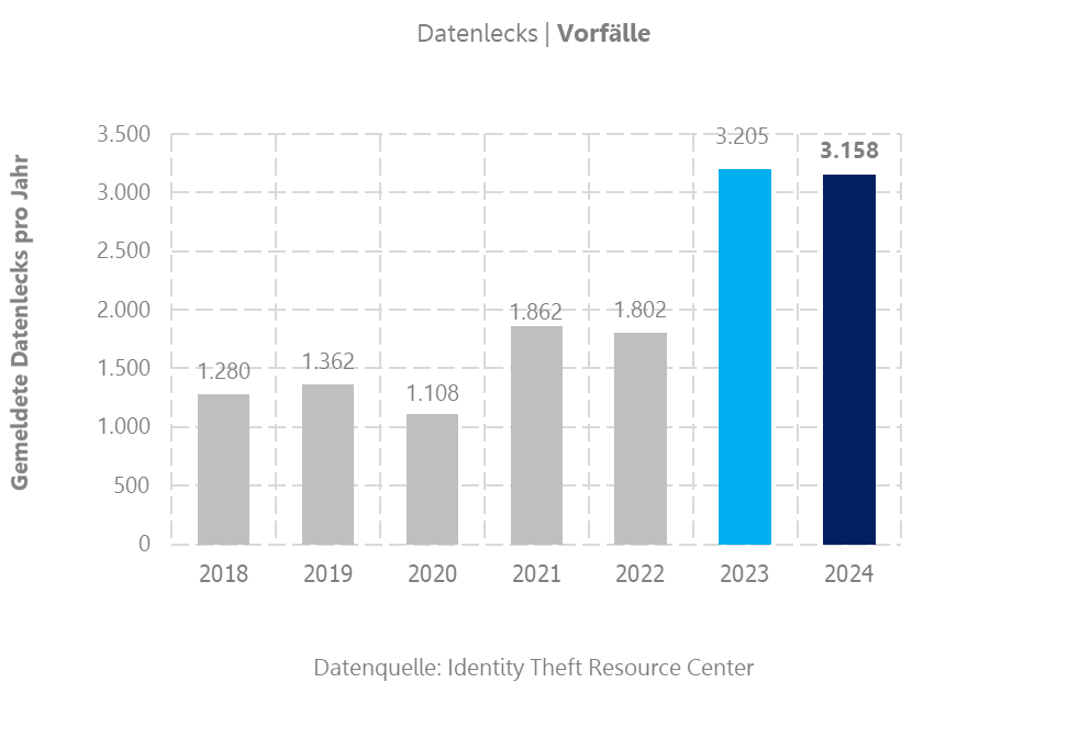 Im Jahr 2024 wurden durch das US-amerikanische Identity Theft Resource Center insgesamt 3.158 Vorfälle im Zusammenhang mit dem Verlust, dem Diebstahl oder der Offenlegung von personenbezogenen Daten verzeichnet. Das entspricht einem leichten Rpckgang von rund 1,5 Prozent zum Vorjahr.