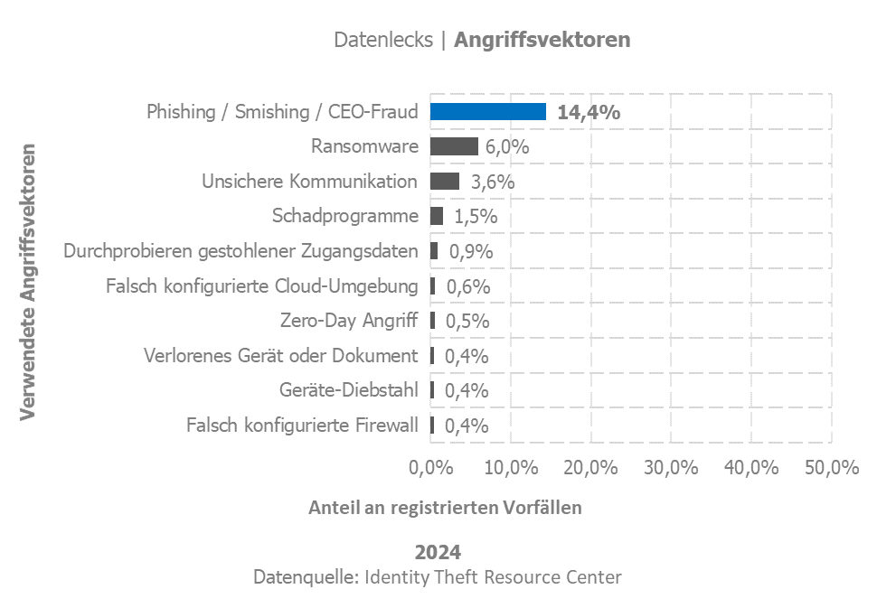 Cyberangriffsmethoden wie Phishing, Smishing und CEO-Fraud waren im Jahr 2024 mit 14,4 Prozent die häufigsten Gründe für Datenlecks, gefolgt von Ransomware mit 6 Prozent, unsicherer Kommunikation mit 3,6 Prozent sowie weiteren Schadprogrammen mit 1,5 Prozent.