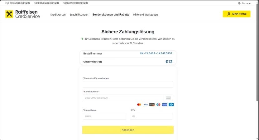 Zum Abschluss wartet die „Sichere Zahlungslösung“, die Versandkosten sollen doch bitte via Kreditkarte beglichen werden. Ein Klick auf „Absenden“ übermittelt auch diese Daten direkt an die Betrüger/innen. Das Geld ist weg, der Datenbankeintrag komplettiert, die Falle schnappt zu.