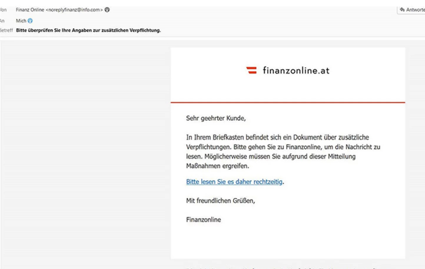 „Bitte überprüfen Sie Ihre Angaben zur zusätzlichen Verpflichtung“ lautet der Betreff eines betrügerischen E-Mails angeblich von FinanzOnline.